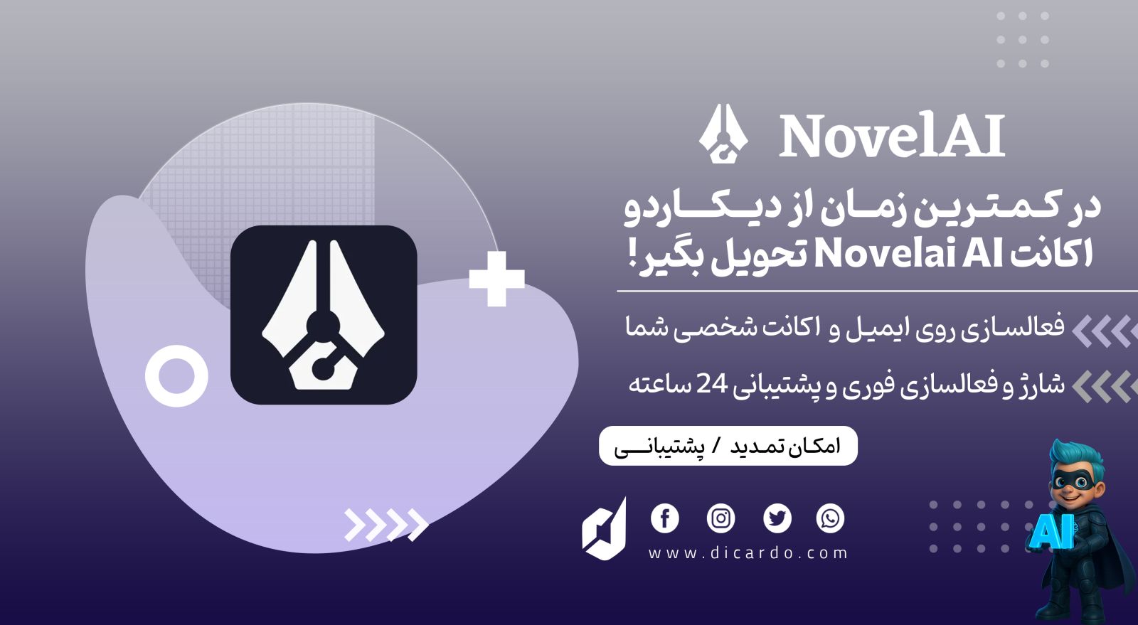 دیکاردو اولین وبسایت در زمینه پرداختهای درون برنامهای میباشد که موفق به کسب مجوز رسمی از بنیاد ملی بازیهای رایانهای شده است. همچنین دیکاردو با ایجاد سرورهای امن و نیروهای متخصص و پشتیبانی 24 ساعته، همیشه آماده خدمت رسانی به مشتریان خود می باشد پس ما با افتخار یکی از معتبرترین سایتهای خرید اکانت ناول ای آی NovelAI هستیم.
