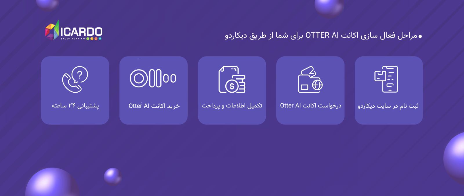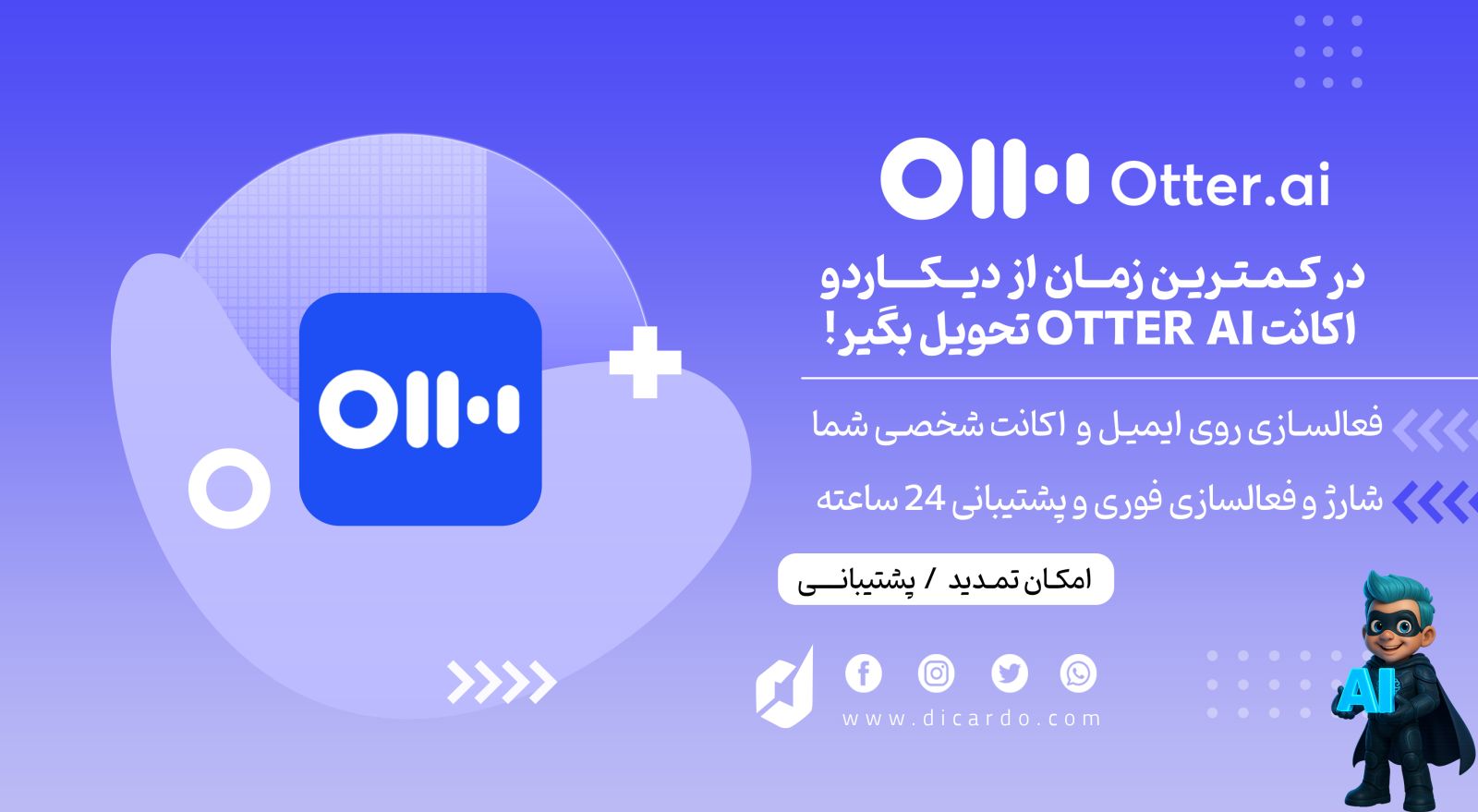 دیکاردو اولین وبسایت در زمینه پرداخت های درون برنامهای است که موفق به کسب مجوز رسمی از بنیاد ملی بازیهای رایانهای شده است. همچنین دیکاردو با ایجاد سرورهای امن و نیروهای متخصص و پشتیبانی 24 ساعته، همیشه آماده خدمت رسانی به مشتریان خود میباشد پس ما با افتخار یکی از معتبرترین سایتهای خرید اکانت Otter ai هستیم.